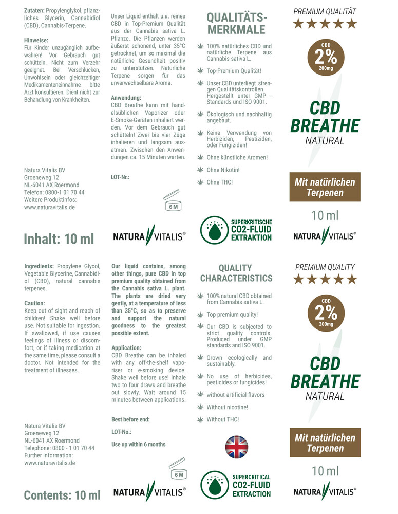 Das erstklassige Breathe-CBD wird unter größter Sorgfalt nach EU-Qualitätsstandard hergestellt und abgefüllt. Sie können es sofort verwenden. Kein Abmessen, Abmischen oder Dosieren ist mehr notwendig. Es ist also kinderleicht und zeitsparend. Zudem ist unser Liquid frei von THC und enthält keine künstlichen Aromen, keine Herbizide, Pestizide und Fungizide. Und selbstverständlich kein Nikotin!